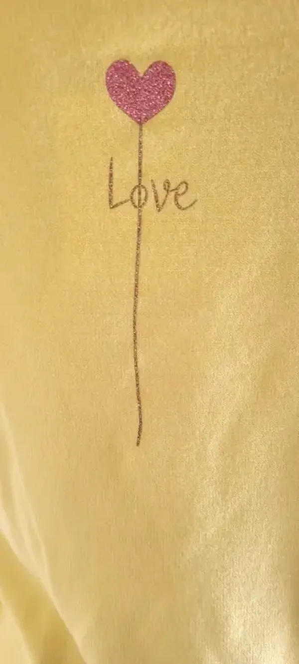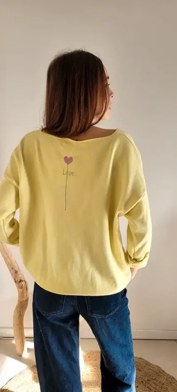 Pull col V jaune 🌼 Coeur pailleté à l'avant Inscription love et coeur pailleté au dos Matière: 50% Viscose 28% Polyester 22% polyamide 📍